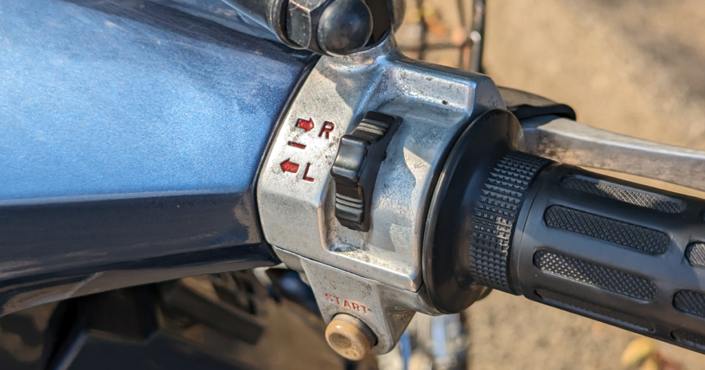 古い角目カブ、大好きなんだけど、このウインカースイッチの位置だけはどうしても不満が残る。