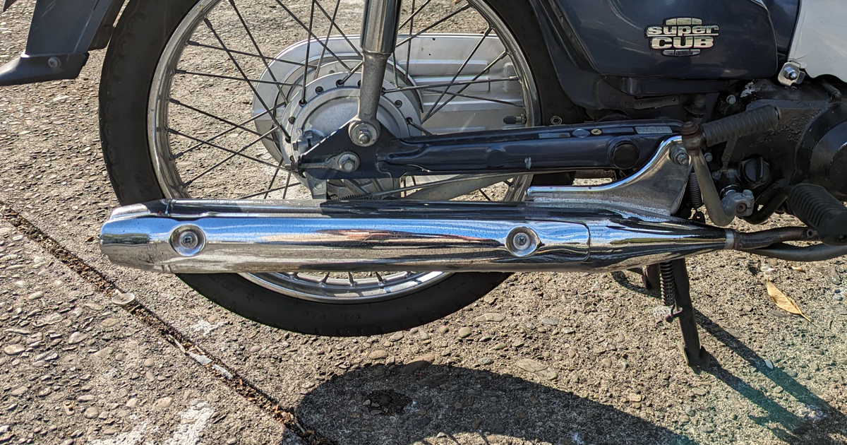 もともと、買った時から、マフラー内部でなにか部品が外れてるかどうかしてたらしく、アクセルを戻す度に『カラカラカラカラ・・・』とかなり目立つ音がしていたので、時間ある時にこの角目カブを購入したお店に相談。